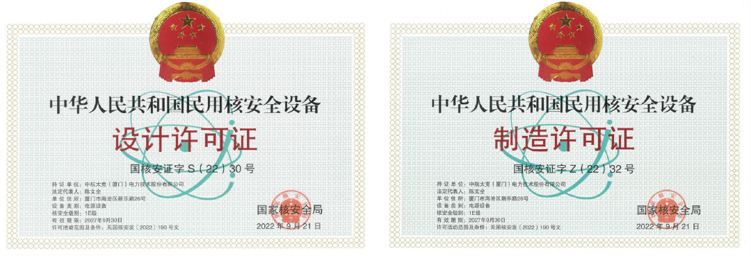 ▲国家核安全局民用核安全电源设备设计和制造许可证