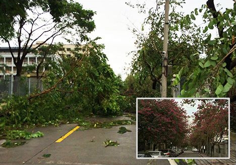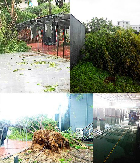 在台风的肆虐下,偏安一隅幽静的中航太克也难以幸免,20多年的参天大树轰然倒地,大批的树儿不见了挺拔的身姿,坚固的车棚撕碎了外衣,新建的厂房顶帽掀起了一角,洁净的车间地面聚集起雨水……